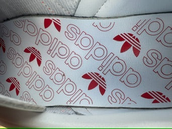 Zum Verkauf steht ein Adidas Samba Classic in Weiß/Rot.